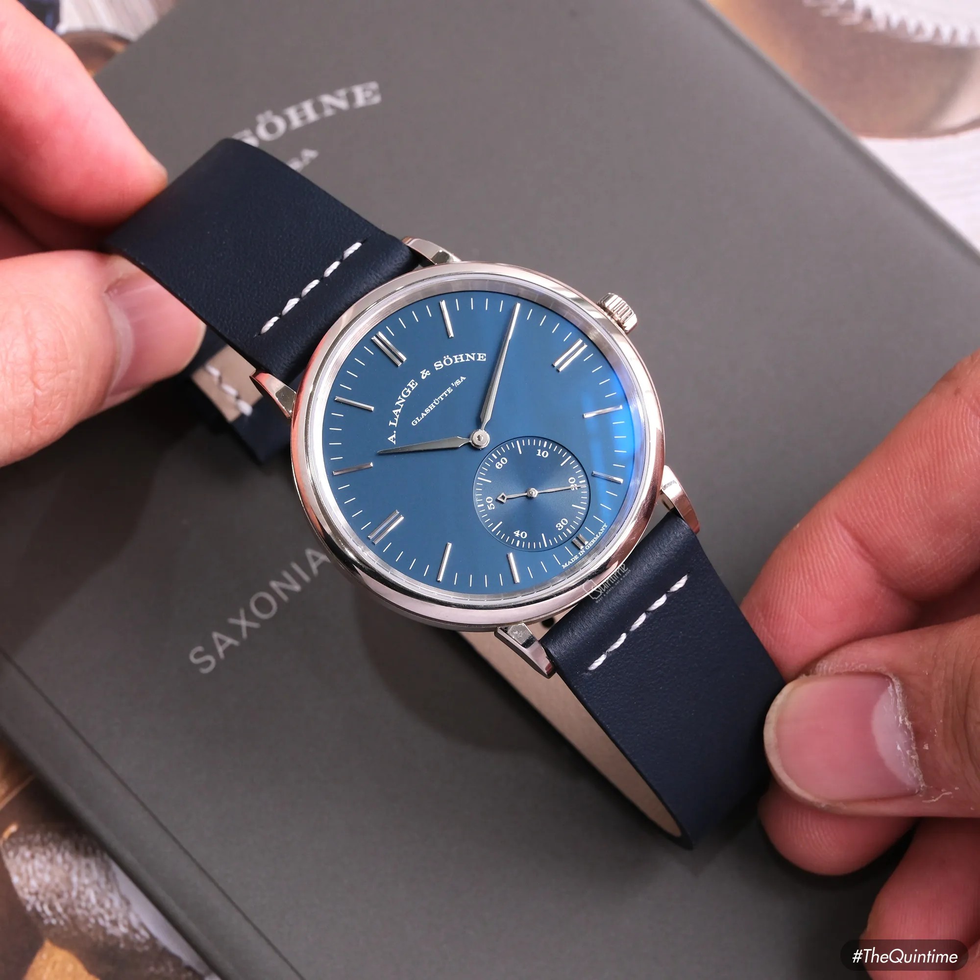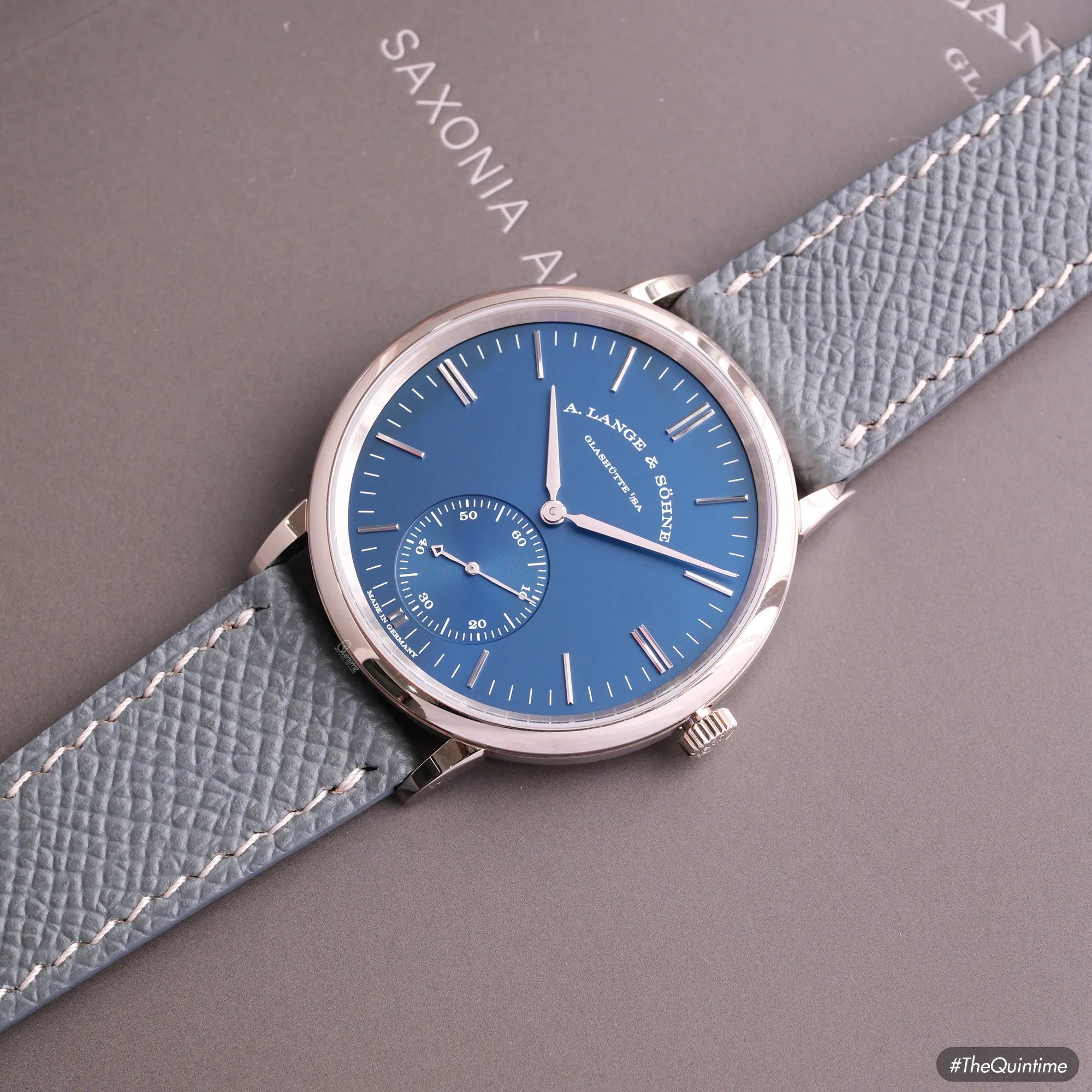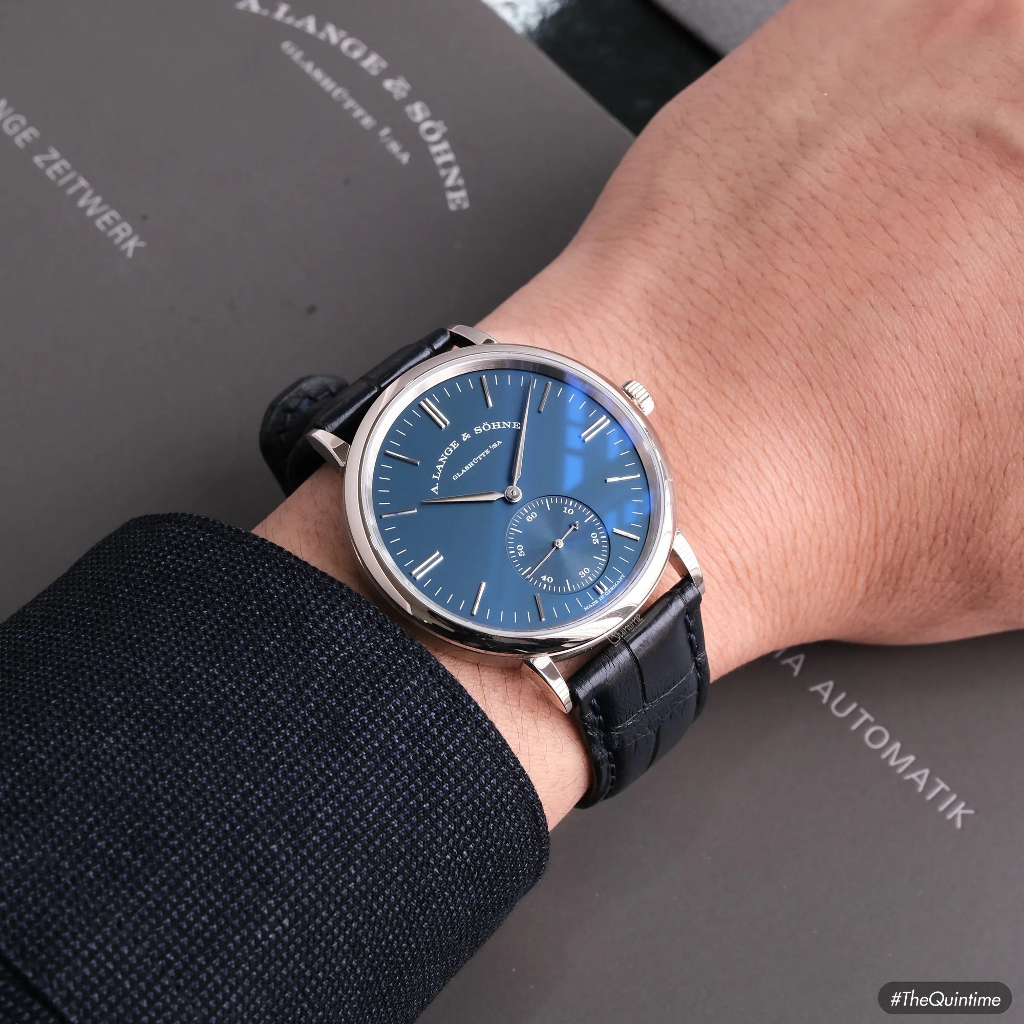 A. Lange & Sohne Saxonia Automatic "Blue Series" 380.028 18K white gold SAXONIA – A collection named after the town in the state of Saxony, considered the pioneering cradle of Germany’s scientific and technical development. In 1839, Saxony produced the very first locomotive ever to be “Made in Germany.” Only a few years later, a native of the region — Ferdinand Adolph Lange — established a new standard in watchmaking. His mission was to continually improve the design of mechanical movements, refining them toward perfection and laying the foundation for the design philosophy we know today. The models in this collection stand as a testament to his passion and dedication, expressed through a minimalist design language without the need for ornate decorations or elaborate motifs. • The Saxonia collection debuted in 1994 with a solid caseback and a hand-wound movement operating at 3Hz with a 45-hour power reserve. • From 1994 to 2007, pieces in this collection featured compact proportions: a diameter of just 33.9mm and a thickness of 9.1mm. During this era, the outsized date was incorporated into A. Lange & Söhne’s design language. • Starting in late 2007, the brand shifted to a 37mm diameter with a reduced thickness of 7.3mm, aligning with contemporary tastes. The big date display was removed, and several changes were made to the subdial layout and minute track. The A. Lange & Söhne Saxonia automatic 380.028 belongs to the "Blue Series" launched in 2017, alongside the Lange 1 (191.028), Lange 1 Daymatic (320.028), and Saxonia (219.028). • Its 38.5mm diameter, compact 44.5mm lug-to-lug span, and 7.8mm thickness provide exceptional wrist comfort. • The dial is crafted from solid 925 silver, finished in a light navy blue with a matte texture that creates a deeply attractive visual presence. • It is powered by the automatic calibre L086.1, replacing previous Langematik movements and offering an upgraded 72h power reserve. Signature Lange elements- such as the hand-engraved balance cock, German silver plates, and meticulous finishing techniques - remain fully preserved. This is truly one of the most collectible references within the Saxonia family, as Lange rarely incorporates navy-blue dials into its production. For that reason, although released in 2017, this model remains exceptionally scarce on the market even today.