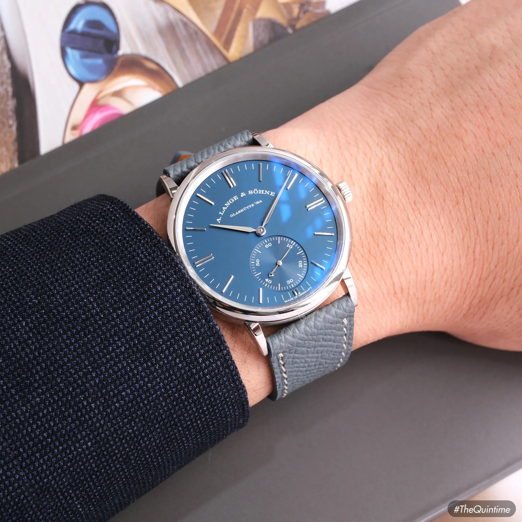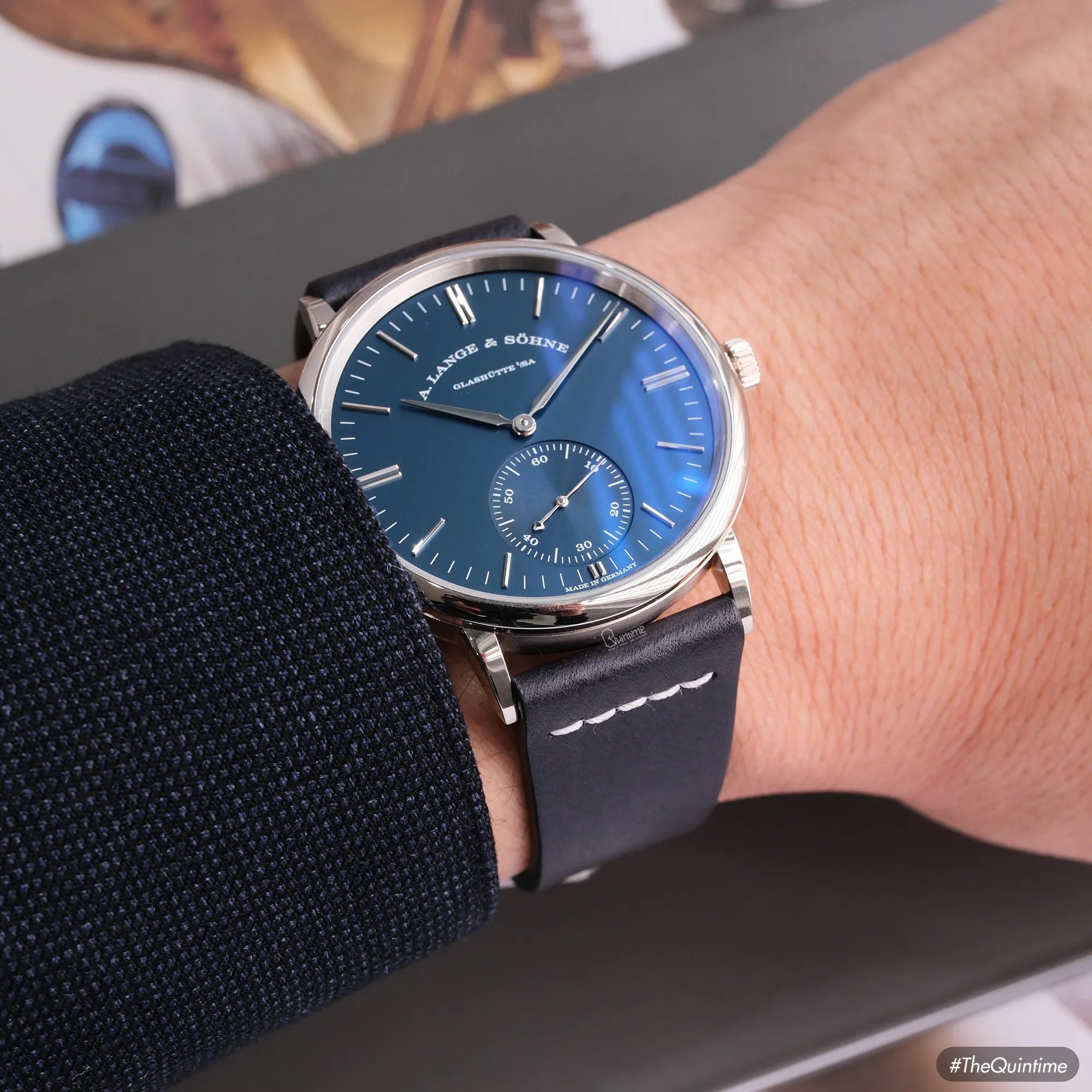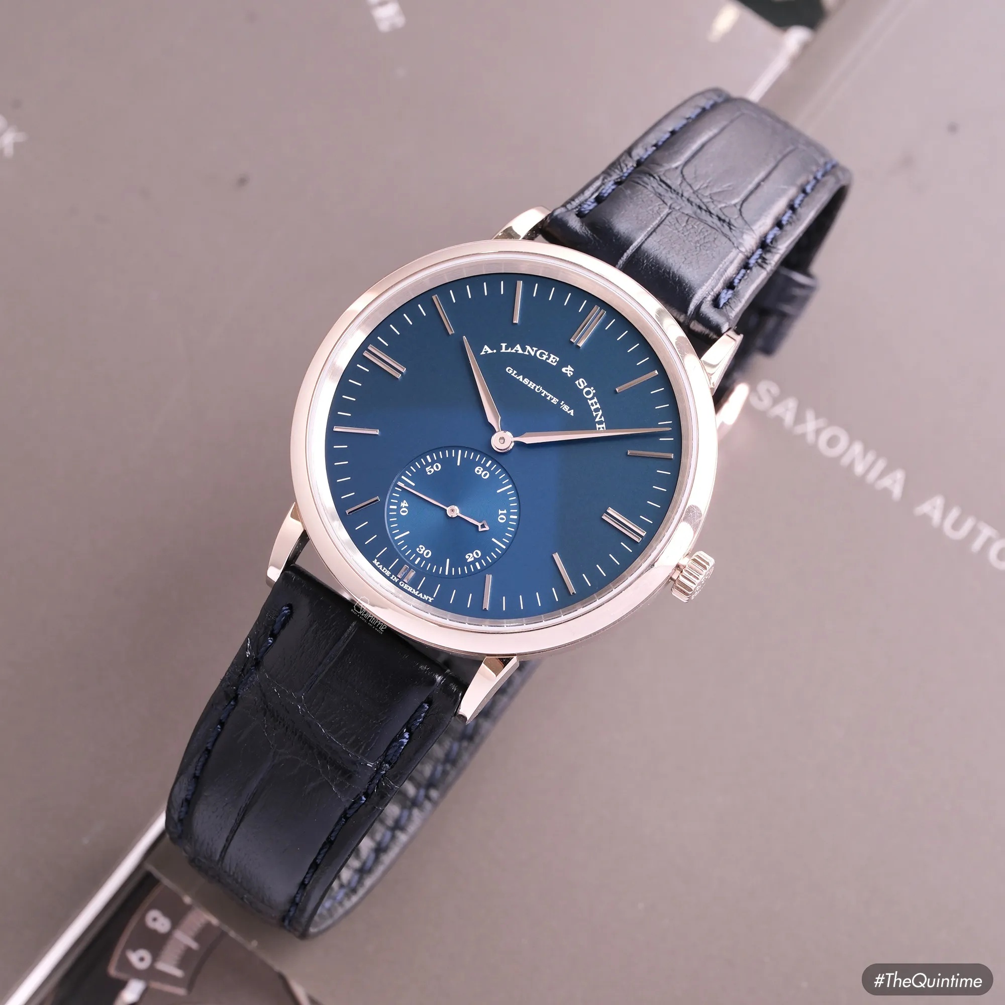 A. Lange & Sohne Saxonia Automatic "Blue Series" 380.028 18K white gold SAXONIA – A collection named after the town in the state of Saxony, considered the pioneering cradle of Germany’s scientific and technical development. In 1839, Saxony produced the very first locomotive ever to be “Made in Germany.” Only a few years later, a native of the region — Ferdinand Adolph Lange — established a new standard in watchmaking. His mission was to continually improve the design of mechanical movements, refining them toward perfection and laying the foundation for the design philosophy we know today. The models in this collection stand as a testament to his passion and dedication, expressed through a minimalist design language without the need for ornate decorations or elaborate motifs. • The Saxonia collection debuted in 1994 with a solid caseback and a hand-wound movement operating at 3Hz with a 45-hour power reserve. • From 1994 to 2007, pieces in this collection featured compact proportions: a diameter of just 33.9mm and a thickness of 9.1mm. During this era, the outsized date was incorporated into A. Lange & Söhne’s design language. • Starting in late 2007, the brand shifted to a 37mm diameter with a reduced thickness of 7.3mm, aligning with contemporary tastes. The big date display was removed, and several changes were made to the subdial layout and minute track. The A. Lange & Söhne Saxonia automatic 380.028 belongs to the "Blue Series" launched in 2017, alongside the Lange 1 (191.028), Lange 1 Daymatic (320.028), and Saxonia (219.028). • Its 38.5mm diameter, compact 44.5mm lug-to-lug span, and 7.8mm thickness provide exceptional wrist comfort. • The dial is crafted from solid 925 silver, finished in a light navy blue with a matte texture that creates a deeply attractive visual presence. • It is powered by the automatic calibre L086.1, replacing previous Langematik movements and offering an upgraded 72h power reserve. Signature Lange elements- such as the hand-engraved balance cock, German silver plates, and meticulous finishing techniques - remain fully preserved. This is truly one of the most collectible references within the Saxonia family, as Lange rarely incorporates navy-blue dials into its production. For that reason, although released in 2017, this model remains exceptionally scarce on the market even today.
