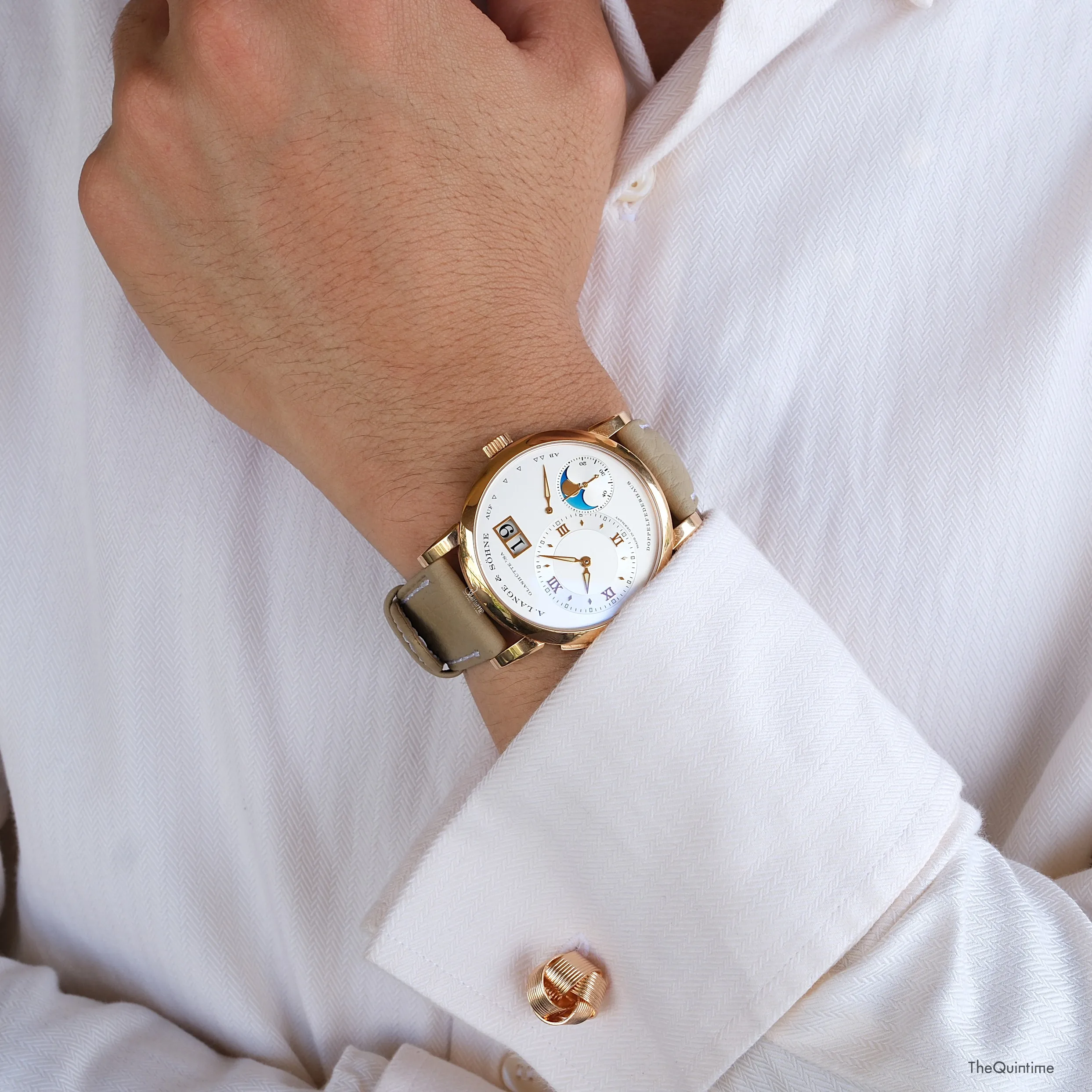 Dòng Lange 1 được hãng ra mắt lần đầu tiên năm 1994, đây cũng được xem là năm thương hiệu A.Lange & Soehne được tái sinh, sau 50 năm ảnh hưởng bởi thế chiến thứ II. - Thiết kế đặc trưng của dòng Lange 1 là lịch outsized date được bố trí, sắp xếp theo #tỷ_lệ_vàng 1.618 - Bộ kim không đồng trục, được sắp xếp cân xứng trên mặt số. - Dòng Lange 1 đầu tiên được trang bị bộ máy L901.0, sử dụng bộ bánh răng truyền động của #JLC_calibre_822. - Năm 2003 thì hãng cho ra mắt chiếc Lange 1 moonphase (Mã 109.032), nâng cấp lên bộ máy L901.5. Mặt sau của bộ máy được thiết kế mâm 3/4, ở giữa có hai ô khoanh vùng, được hãng nhắc đến với cái tên #Little_Islands - 12 năm sau (năm 2015) hãng tiếp tục nâng cấp dòng Lange 1 moonphase, phong cách hiện đại hơn (mã 192.032 & 192.029). Dòng này cũng có một số thay đổi đáng chú ý so với phiên bản cũ 2003: .....+ Về phần mặt số, font chữ được thiết kế nhỏ hơn một chút, viền bezel cũng mỏng hơn để phù hợp với phong cách hiện đại mà hãng hướng tới. .....+ Đặc biệt, moonphase đã được làm đẹp hơn rất nhiều, thêm tính năng day/night indicator. .....+ Ô lịch outsized date nhảy mượt hơn (thay vì cơ cấu kéo dịch như bản cũ) .....+ Máy thì đã được A.Lange nâng cấp lên calibre L121.3: Khu vực bánh xe cân bằng thay đổi từ vị trí đối diện sang vị trí gần núm, các đảo nhỏ cũng được lược bỏ đi (little islands) .....+ Phần thay đổi quan trọng nữa đó chính là bộ bánh răng truyền động đã được sản xuất 100% bởi A.Lange, không còn dùng của JLC nữa.